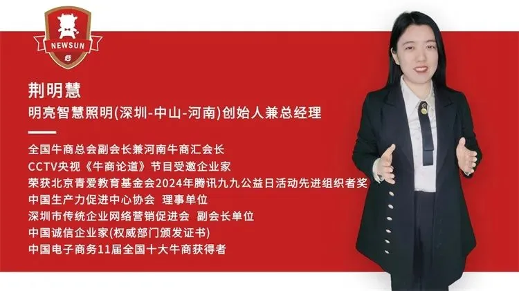 明亮智慧照明(深圳)集团创始人荆明慧,人称“光明姐姐”,十九年来深耕户外照明领域,用光影为城市与景区赋能,更以国学智慧诠释着“光与环境和解”的设计哲学。