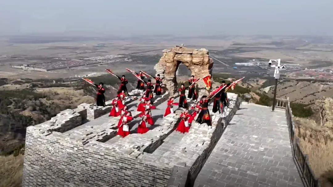活动现场气氛热烈,演员们精神抖擞、身姿矫健,一招一式尽显传统文化底蕴。鲜艳的旌旗迎风招展,与古朴的老城、壮美的景观交相辉映,构成一幅文旅交融、喜庆热闹的动人画卷。