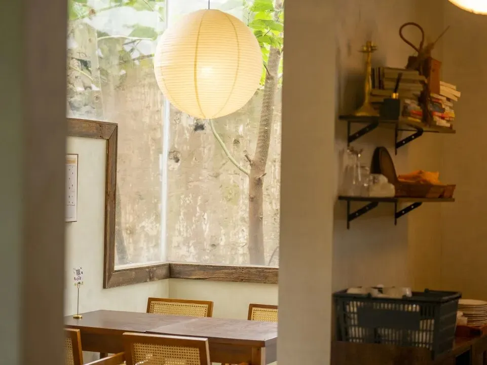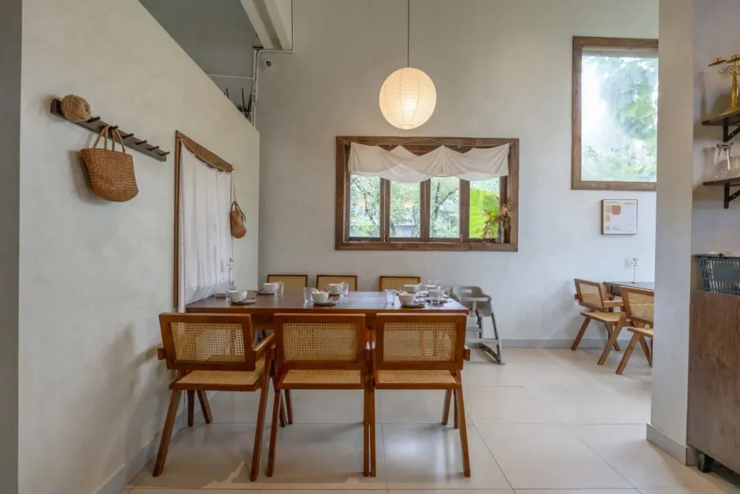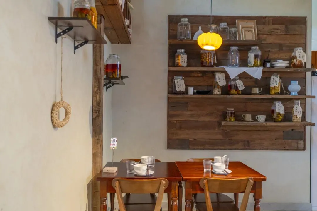 阳光穿过青杉食集的窗户在木桌上洒下斑驳光影,四周是鸟鸣与风声。