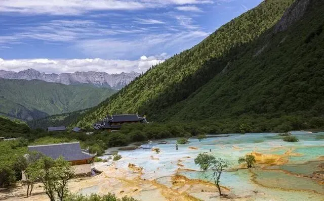 钙华彩池美到不真实 , 乳黄色沉积物层层叠叠像龙鳞 , 商业化比九寨沟低很多 , 人也少 , 体验舒服。