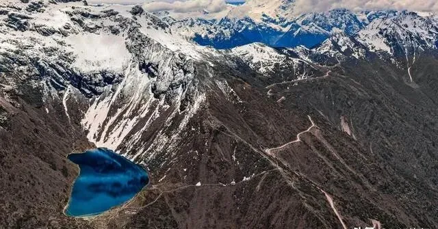 蒙达拉山口翻过去 , 海拔快5000。 冬天湖面冻成蓝冰!脚底下透明的蓝 , 头顶库拉岗日群峰 , 踩在上面拍照 , 有点不真实~