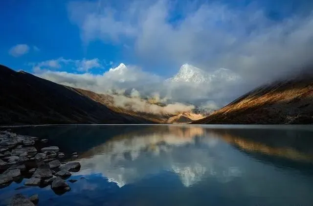 色乡出发徒步进去 , 没路牌 , 没游客。 库拉岗日、过拉卡日成排倒映在湖里 , 只有你和神山圣湖面对面 , 这种震撼 , 坐车到不了的。