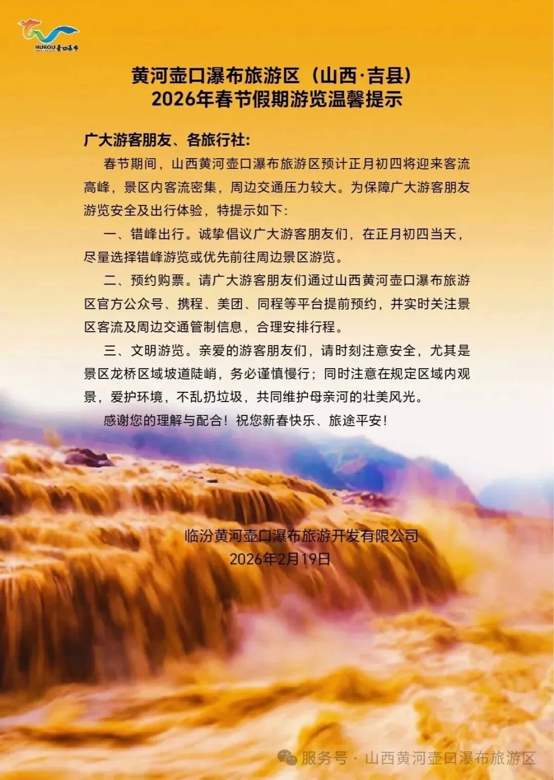 黄河壶口瀑布旅游区(山西•吉县)2026年春节假期游览温馨提示