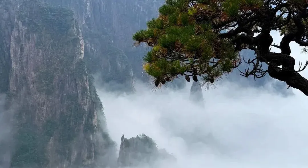 三月的黄山,春雪未融,春花已开,云海翻涌间是绝美的春日画卷。