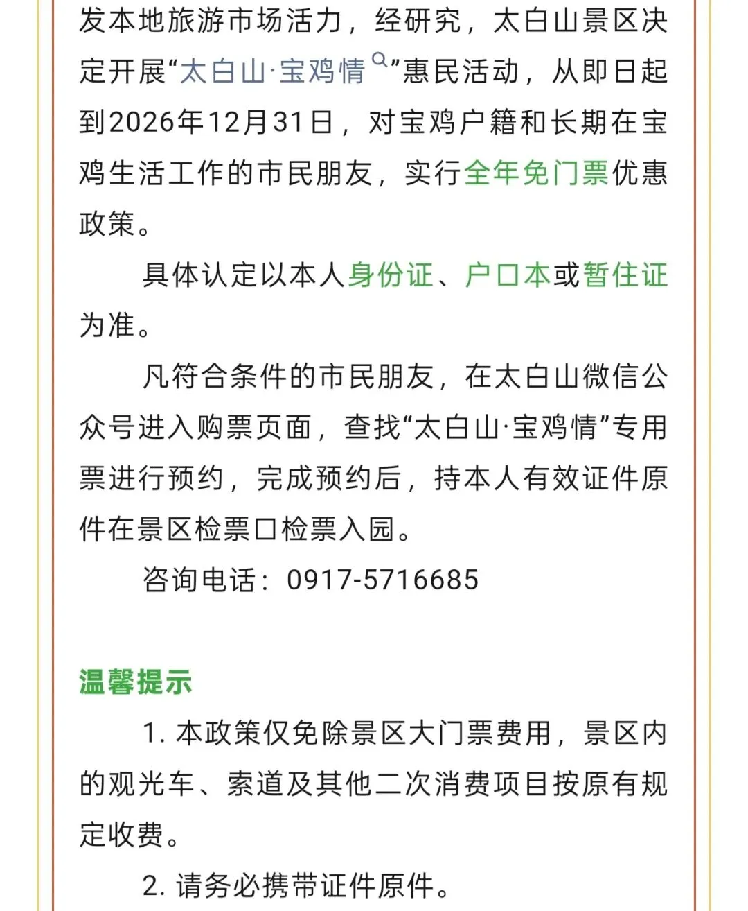 温馨提示:1. 本政策仅免除景区大门票费用,景区内的观光车、索道及其他二次消费项目按原有规定收费。2. 请务必携带证件原件。3. 为确保游览安全与秩序,请遵守景区各项管理规定,文明旅游。4. 此优惠政策最终解释权归太白山景区所有。