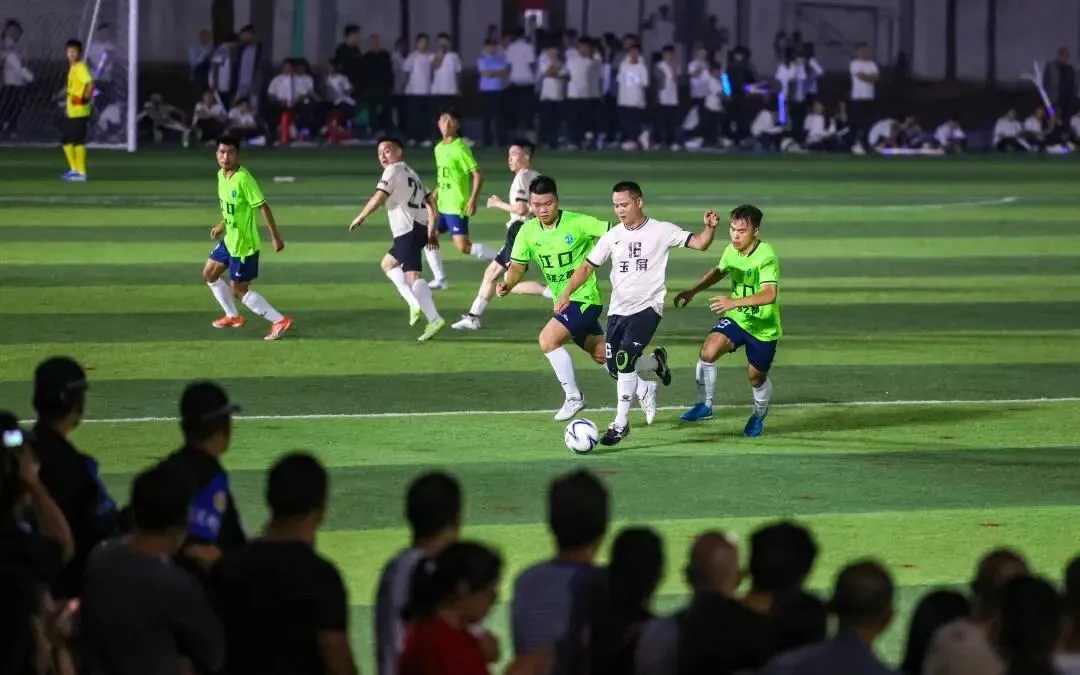 梵净山足球联赛足球场,球员在比赛中拼抢。