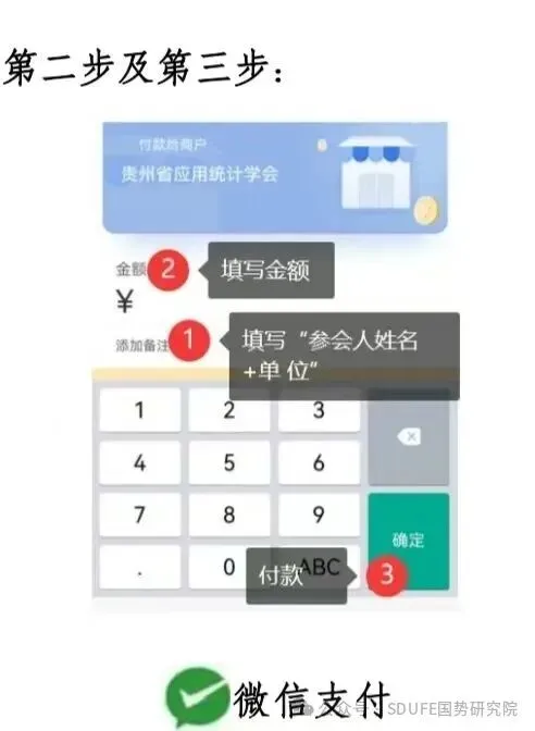 请用微信扫收款二维码;点击“添加备注”,填写“参会人姓名+单位”;在金额处填写会议费金额;最后,点击右下角“付款”按钮,完成会议注册缴费。