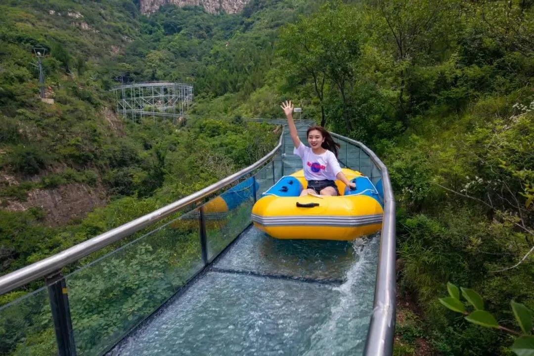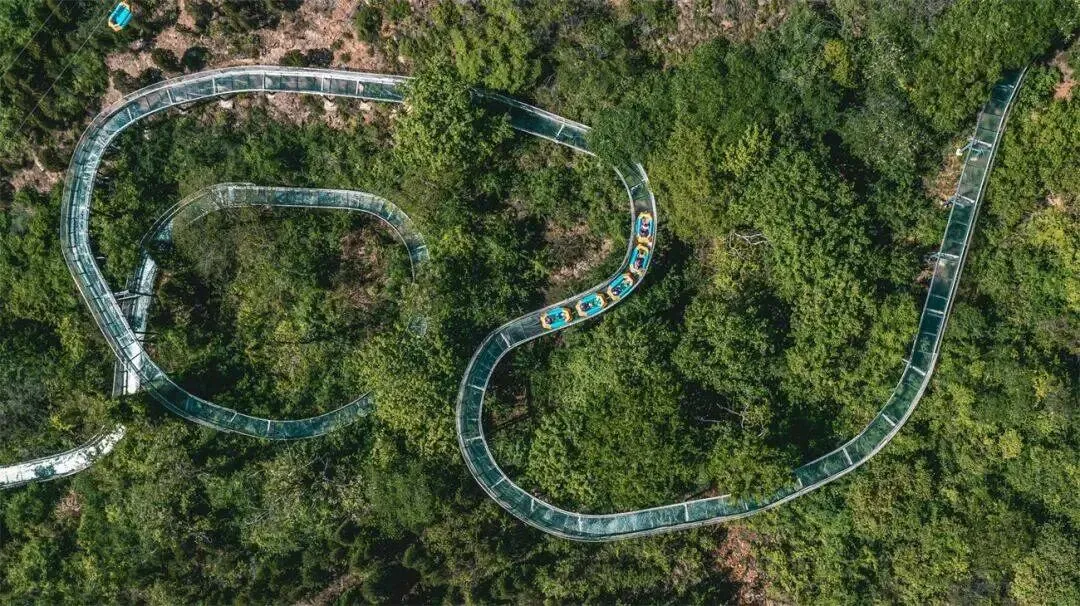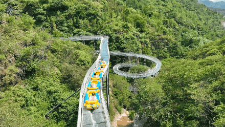 上山途中光是看到悬在半空中的滑道就已经是腿软的程度了!其中既有平缓舒适的直道,可以观赏沿途绿荫放松身心;也有惊险刺激的急转弯道,在水流的冲击下,滑行的速度相当快,如同过山车一样,感受速度与激情带来的酣畅淋漓,弯道部分都实施了加高加固处理,安全有保障;