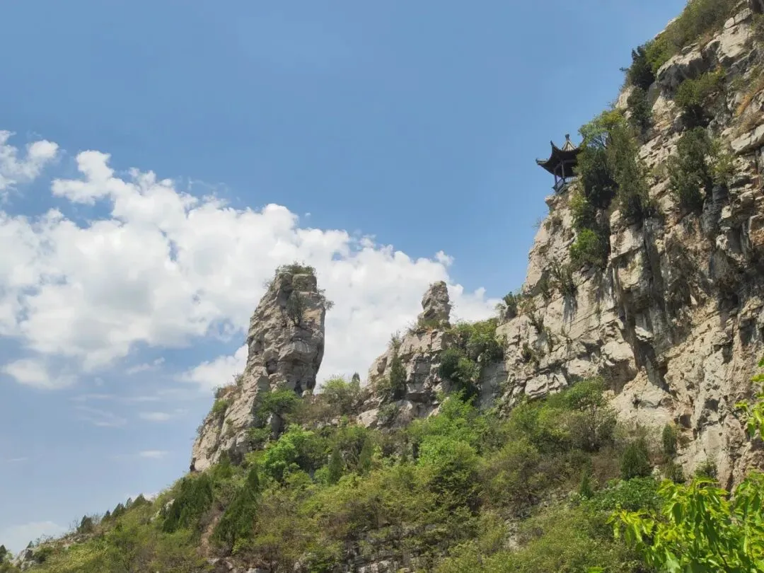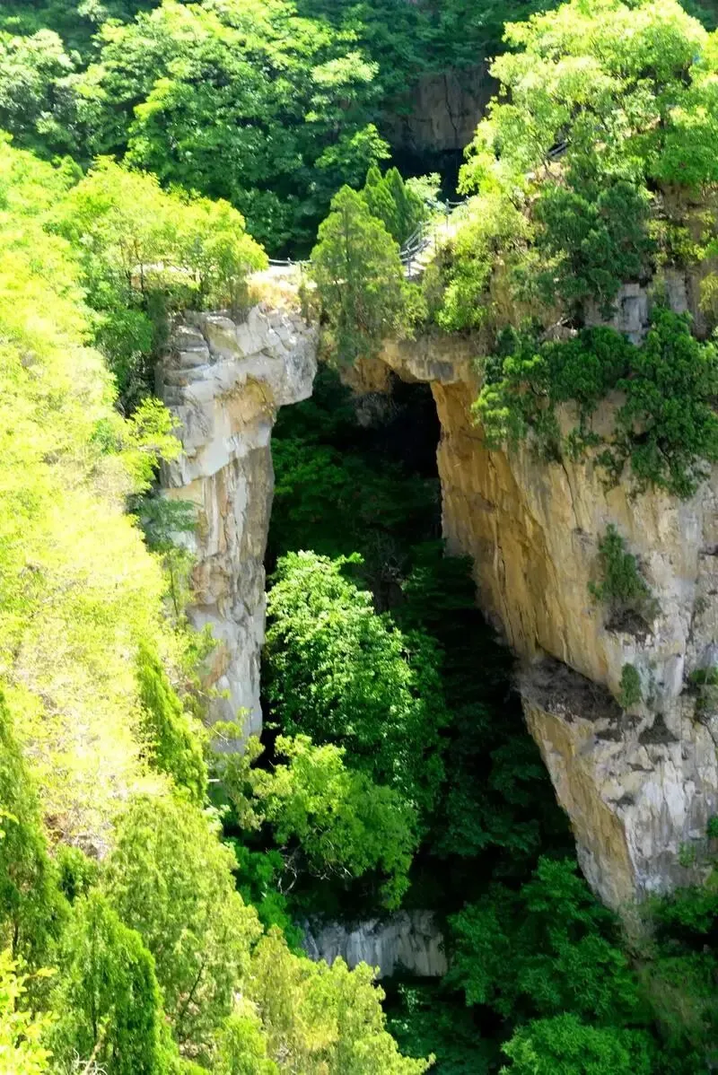 由两块巨大的石块连接两山悬崖形成天然石桥,被称作“昭阳仙桥”,桥长有6米,宽约1米,桥下深涧近百米,为古青州的“八景之一”。立于桥上,抬头仰望山顶,也有一桥与之对应,称为“上下天桥”。