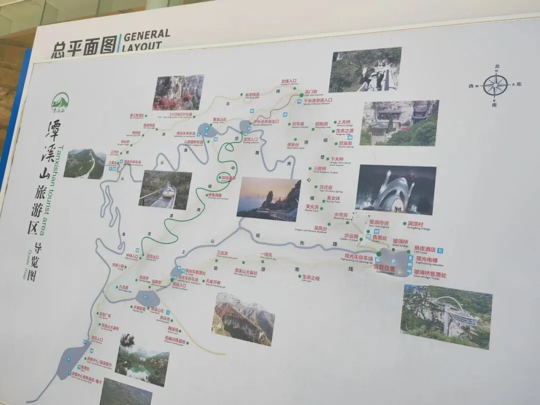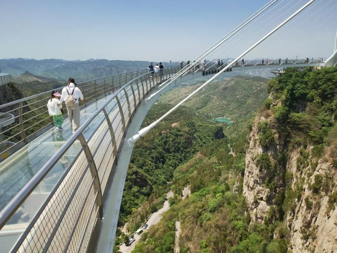 玻璃桥为无背索斜拉弧形玻璃桥,建于潭溪山海拔700米的崖壁之上,桥面跨度117米,悬空高度101米,外弧最大半径90米,总承载可达900吨,单次承载10000人。玻璃桥整体由百米观光电梯、悬崖酒店及玻璃桥体组成。