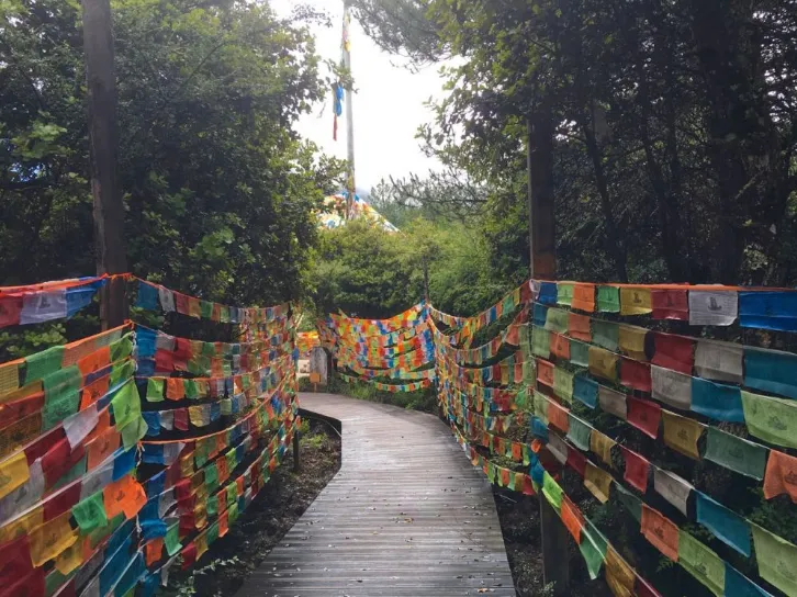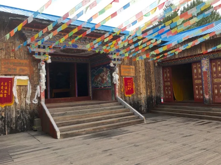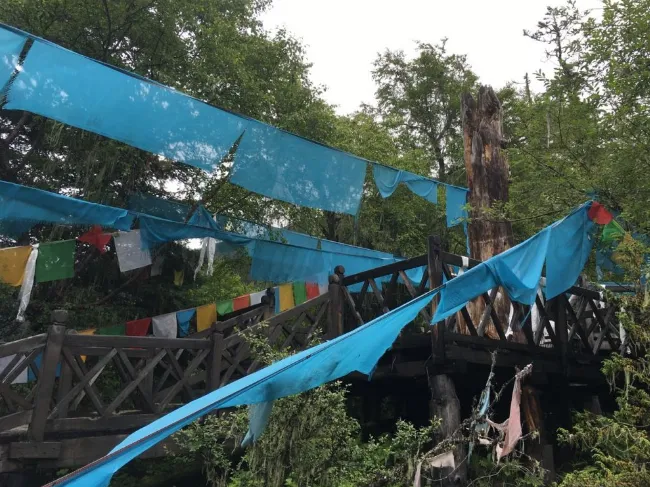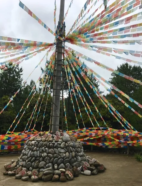 经幡的颜色和排列都是有讲究的,在不同的场地使用不同的颜色代表不同的祈祷,不能混淆。这里是一株被雷电劈死的树桩,与汉人相反藏人认为被雷电所劈是件好事,人们会带一块枯树皮回家,相信会带来吉祥