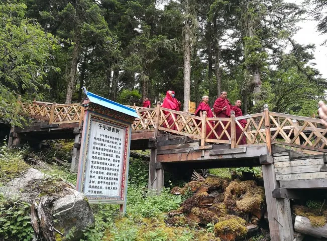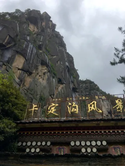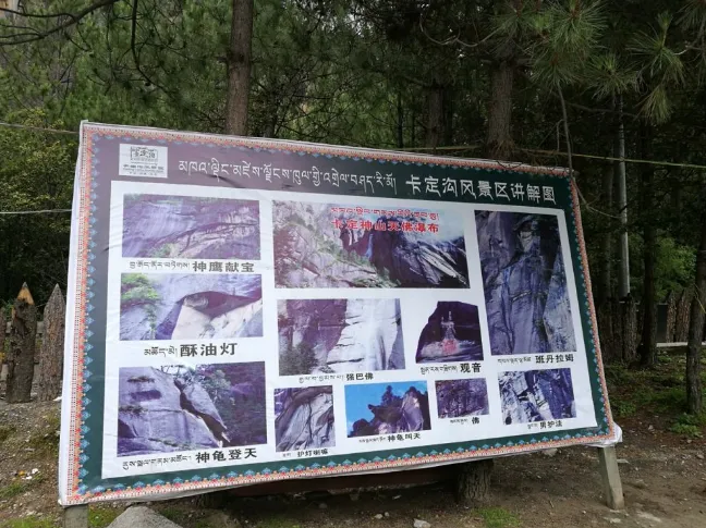 天佛瀑布是沟内的主要景点,瀑布从半山腰一泻而下,落差约200米,水量充足很是壮观。仔细观察瀑布所在处,巨大的岩石像一尊天然形成的佛像,眉目清晰;两边立男女护法各一名,甚是庄严神圣,故得名天佛瀑布。卡定神山的由来至此,在藏人心中有着不同一般的地位。瀑布右侧的女护法贝德拉姆女神高约100多米,她头戴面纱、腰系丝带、手持佛珠,其形象惟妙惟俏、栩栩如生。左侧是济公拜佛,俏皮不羁,形象也很逼真。
