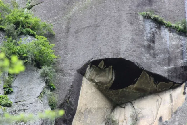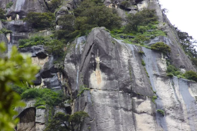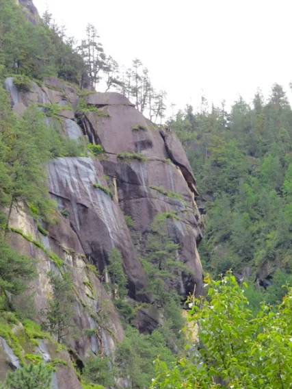 贝德拉姆女神的上方有处天然的红色,好像是一尊绘出来的观音菩萨像。另外还有如来佛、喇嘛颂经、神龟叫天、神鹰献宝、酥油灯等天然形成的佛教景观十余处。我们在小徐的指点下一一仔细辨认,倒也的确说得过去。此时LD来了劲,指着前方的一块岩石说,那是一只大狗还吐着舌头,果然有几分相似,众人点头附和。在这里放飞想象的翅膀,就能体会天人合一的神秘仙境。瀑布对面山峰上的“神鹰献宝”、“神龟驮宝”,也是惟妙惟肖,又引出了一段神奇的传说。