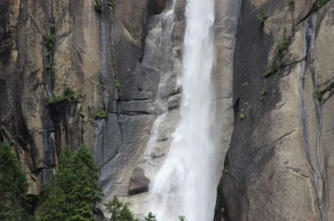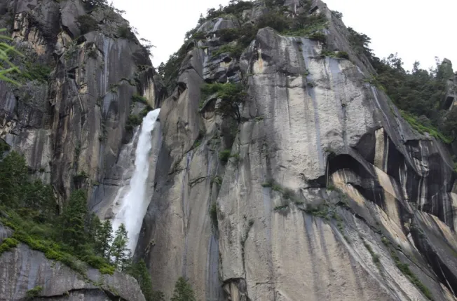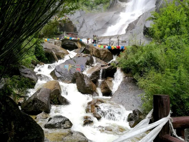 我们一边攀爬,小徐一边给我们讲述那些藏族的民间故事,为我们高海拔登山的疲倦也减压不少。踏着一级级以粗圆木段铺成的台阶,不知不觉登上了观瀑台,飞流直下三千尺的银瀑高高挂着头顶。身旁巨大的岩石上一对少男少女相拥而坐遥望远方,更为这美丽的山间增添了几许诗情画意。