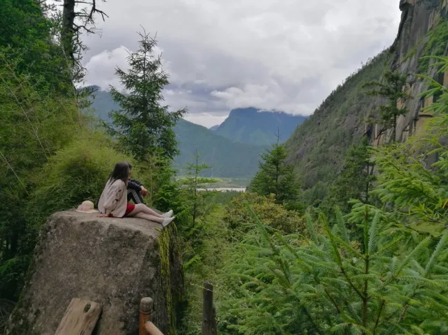 一对小青年坐在岩石上,给美丽的山川增添一抹亮色