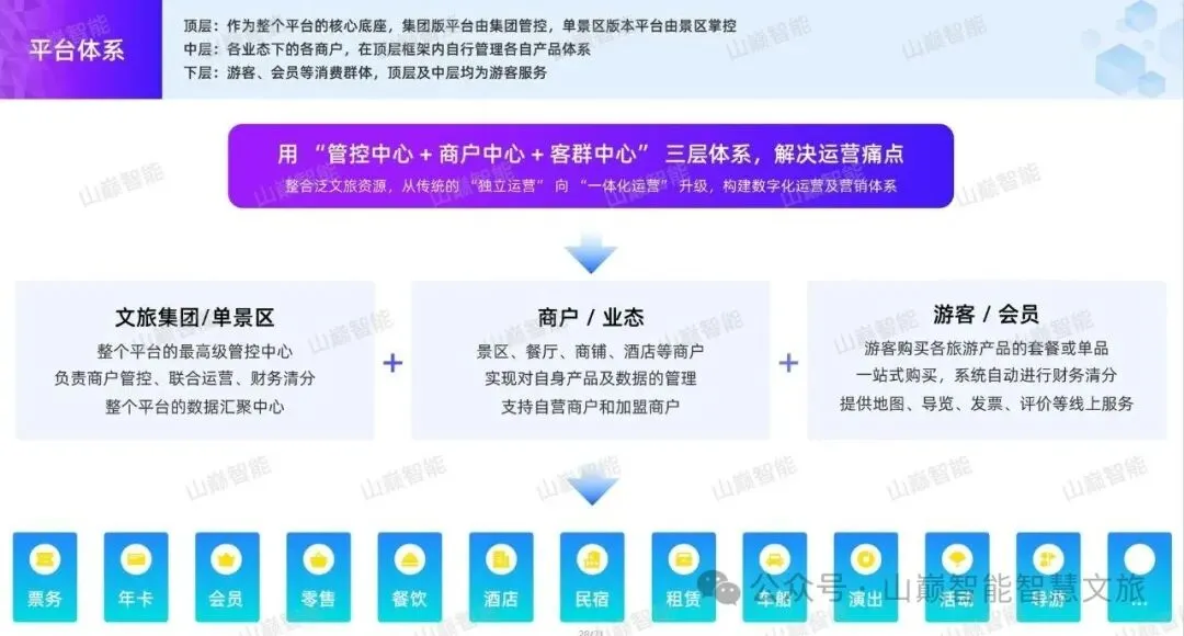 数字文旅平台,又称为“多景区、多业态、多商户一体化运营及营销平台”,改变了传统的多套系统、多个后台、多套数据、各自为政、信息孤岛的混乱模式,实现了从分散型运营向一体化运营的升级。