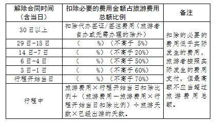 第十五条必要的费用扣除 1.旅游者在行程开始前30日以内提出解除合同或者按照本合同第十二条第2款约定由出境社在行程开始前解除合同的,按下列标准扣除必要的费用: 行程开始前29日至15日,按旅游费用总额的5%; 行程开始前14日至7日,按旅游费用总额的20%; 行程开始前6日至4日,按旅游费用总额的50%; 行程开始前3日至1日,按旅游费用总额的60%; 行程开始当日,按旅游费用总额的70%。 | 第十四条必要的费用扣除 1.在行程开始前30日以内解除合同的,按下列标准扣除必要的费用: 行程开始前29日至15日,按旅游费用总额的5%; 行程开始前14日至7日,按旅游费用总额的20%; 行程开始前6日至4日,按旅游费用总额的50%; 行程开始前3日至1日,按旅游费用总额的60%; 行程开始当日,按旅游费用总额的70%。 双方已在本合同第二十五条或通过其他方式另行约定的,在旅游者解除合同时不受本条中关于解除时间和必要的费用扣除比例的约束。 | 统一文字表述。 |