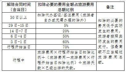 2.在行程中解除合同的,必要的费用扣除标准为: 旅游费用×行程开始当日扣除比例+(旅游费用-旅游费用×行程开始当日扣除比例)÷旅游天数×已经出游的天数。 如按上述第1款或者第2款约定比例扣除的必要的费用低于实际发生的费用,旅游者按照实际发生的费用支付,但最高额不应当超过旅游费用总额。 解除合同的,出境社扣除必要的费用后,应当在解除合同通知到达日起5个工作日内为旅游者办结退款手续。 | 2.在行程中解除合同的,必要的费用扣除标准为: 旅游费用×行程开始当日扣除比例+(旅游费用-旅游费用×行程开始当日扣除比例)÷旅游天数×已经出游的天数。 如按照上述第1款或者第2款约定比例扣除的必要的费用低于实际发生的费用,旅游者按照实际发生的费用支付,但最高额不应当超过旅游费用总额。 出境社应当在解除合同通知到达之日起5个工作日内按照上述约定扣除费用并为旅游者办结退款手续。 | |