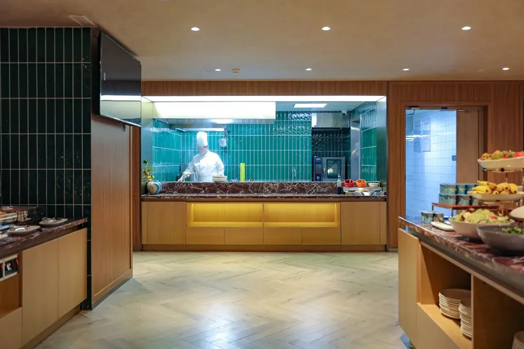 一间餐厅,紧邻大堂,因此在色彩、灯光艺术和桌椅选择上,如出一辙。堂食区可供120人同时用餐,早餐根据入住情况,开设自助或套餐式,搭配健康。同时,聚餐或宴请,可提前预约VIP包厢(仅2间)。