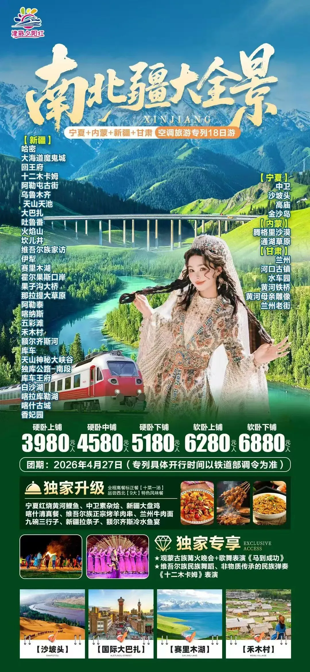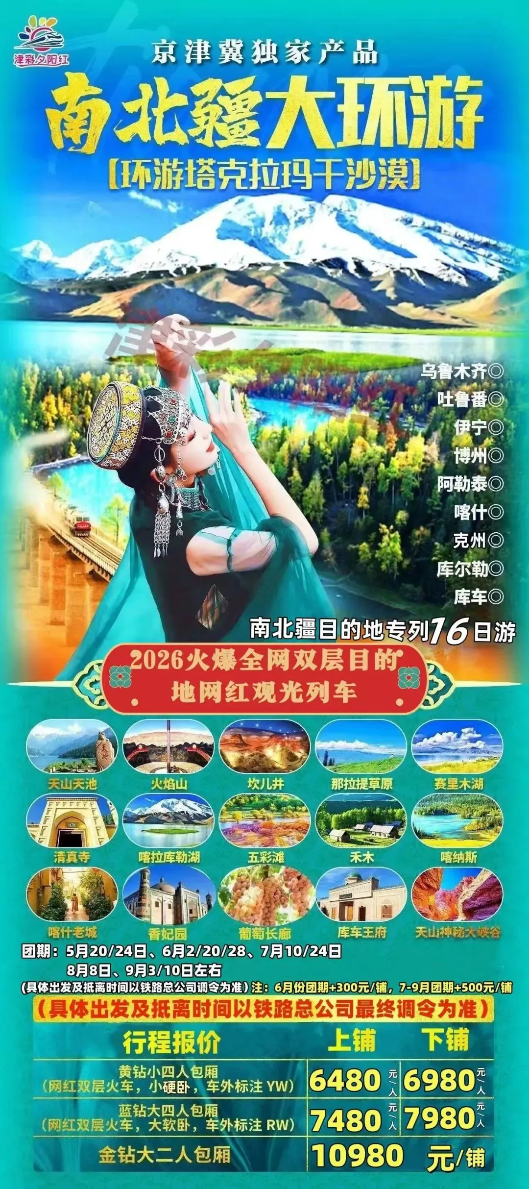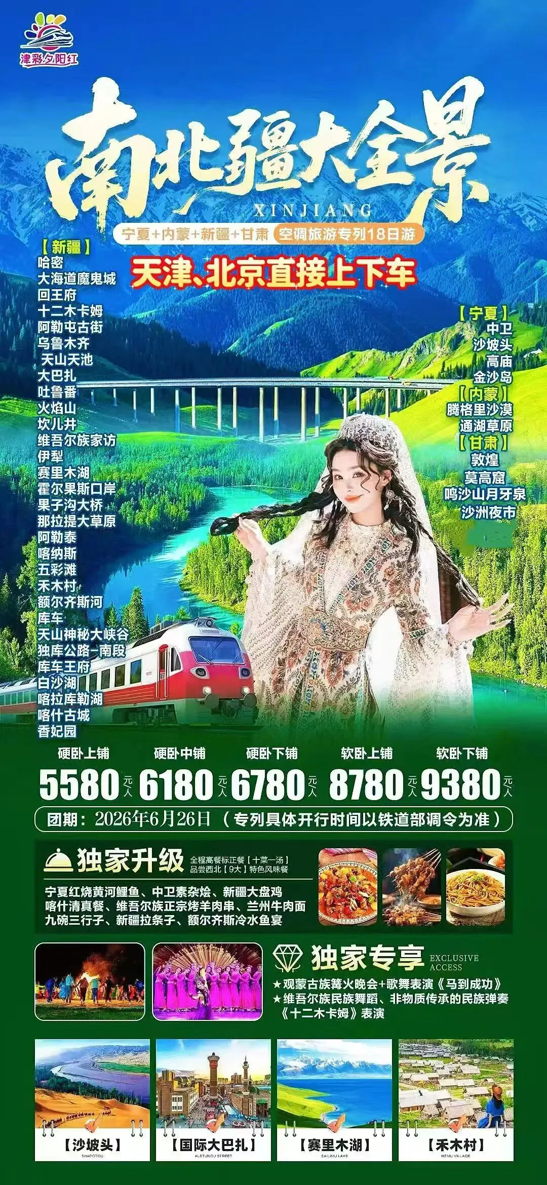 6️⃣7月14日:东西南北疆(新疆🖼全景18日) 7️⃣高端目的地专列:锦绣天府号、什邡号、安逸号、新东方快车、熊猫专列成都号、苍穹号 6月-9月位置有限先到先得