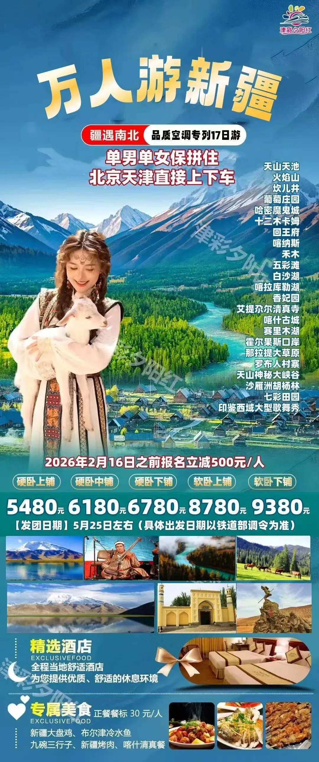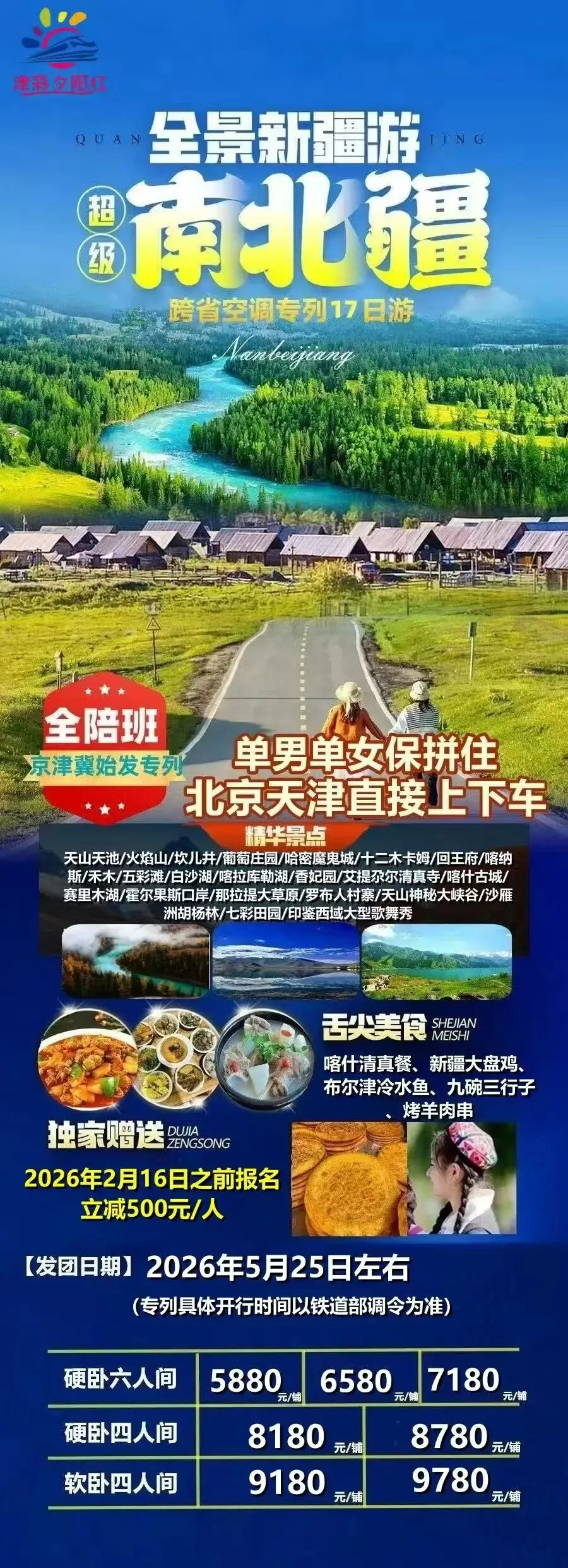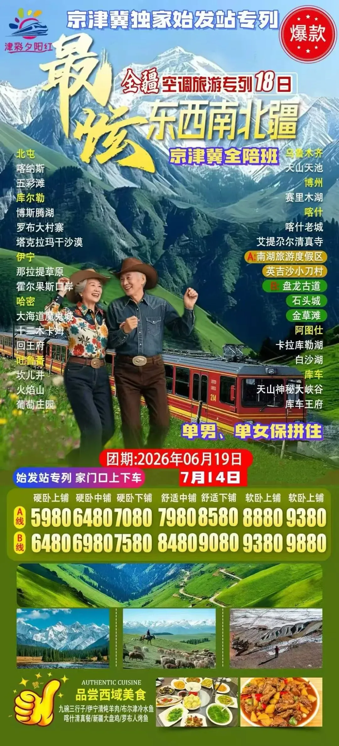 6️⃣7月14日:东西南北疆(新疆🖼全景18日) 7️⃣高端目的地专列:锦绣天府号、什邡号、安逸号、新东方快车、熊猫专列成都号、苍穹号 6月-9月位置有限先到先得