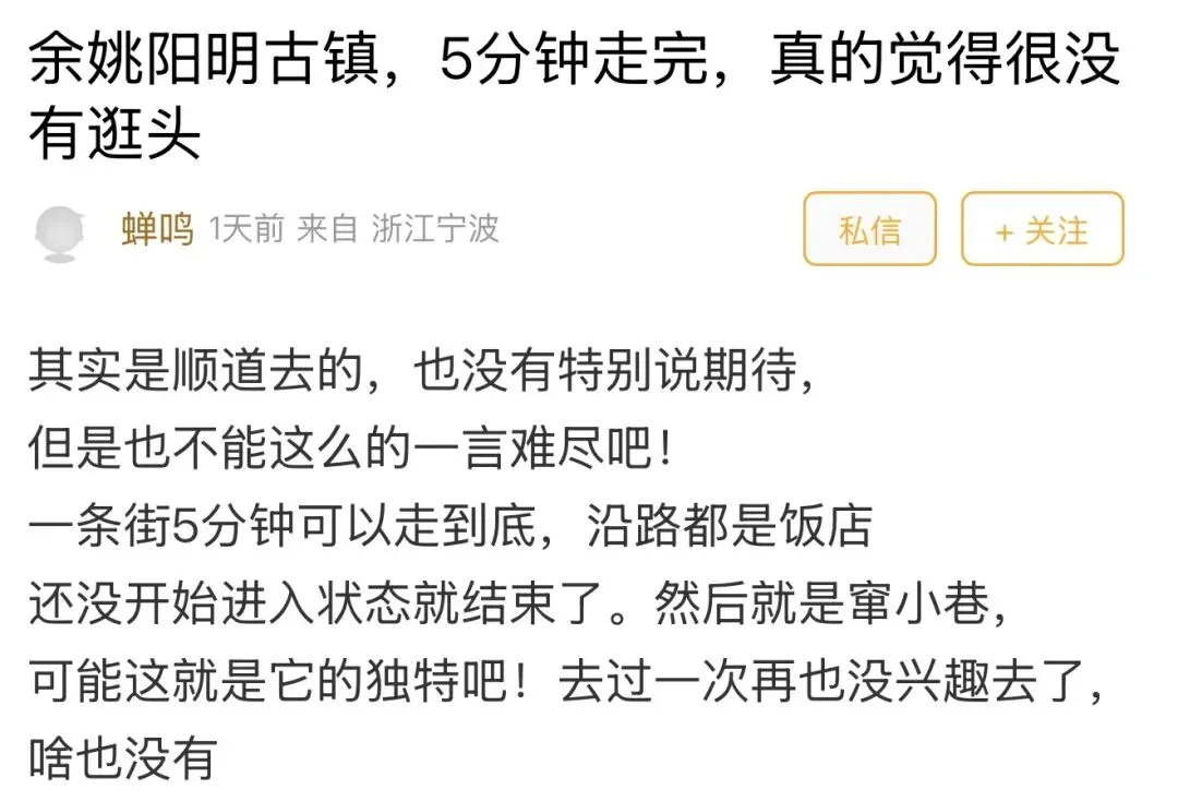 东论网友@蝉鸣发帖,去了趟阳明古镇,感觉没什么逛头,5分钟就能走完: