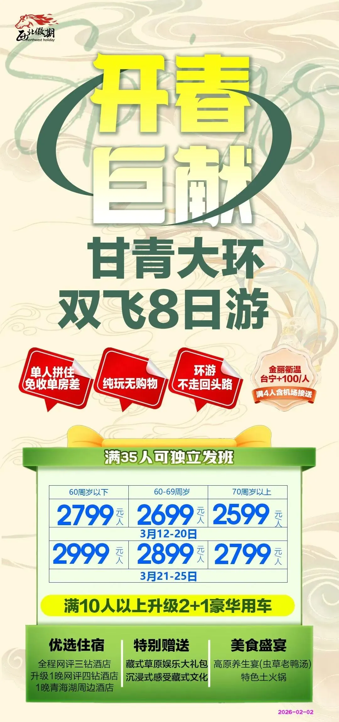 帅锅精选旅游线路信息【2026.03.01】大家好!没看到之前文章的粉丝可能觉得奇怪,股票博主怎么推荐起旅游线路来了?以下链接文章是缘由。 在帅锅这里,也可以报团参加旅游了,就图一个安心 大家关注我是因为股票,所以旅游文章可先忽略,什么时候想去旅游了,能想起帅锅这里也可以报团,不妨考虑一下我这里。 股票不是生活的全部,还有诗和远方,适当的时候,也需要关心一下自己,让自己放松一下,出去走走,我能做的,就是给大家找一些实惠的线路,还有放心的旅行社。 说明事项: 1、以下旅游线路海报,是我从合作旅行社拿过来的【非盗图】,大多是针对浙江出发的,但我们的粉丝如报团旅游,出发地不一定是浙江,所以图中报价仅供参考,根据出发地和目的地的远近,出发交通费会有浮动,请忽略海报中所有关于浙江的字眼,非浙江也可以参加。另外,海报信息不一定完全准确,仅供参考,请通过留言或私信沟通进一步确认。 2、海报中,有二维码的,可以长按图片,识别二维码,查看详细行程和相关事项。 3、粉丝报团参加旅游,如达到独立成团的人数标准,则可独立成团;如没有达到独立成团的人数标准,则为散客拼团。 4、如粉丝有报团旅游的意向,欢迎留言或私信详细咨询,不管最后是否参加,都没有关系,咨询价格和行程,都是必要的过程,不用不好意思。粉丝说明意向后,我会让加个人微信,并组意向沟通群,由客服详细解答粉丝的提问咨询。特别是出发地,不在浙江的,客服会做好衔接工作。 5、我的宗旨:客户确定意向后,让旅行社报实价,给一个无法还价并且无需还价的一口价。让客户在报团旅游时,像是在某马超市购物一样,信任其选品,只要衡量是否愿意支付价格,不用考虑还价的问题;不能像菜市场,价格不透明,看人报价,缺斤短两,还要还价,体验感就不好。 6、从意向沟通,到最后行程结束,我会在群中全程跟踪,如有问题,我会第一时间协调处理,总之不能辜负粉丝对我的信任。 以下为近期精选线路,欢迎留言或私信详细咨询: