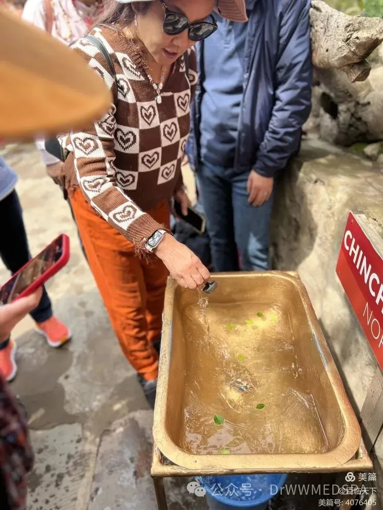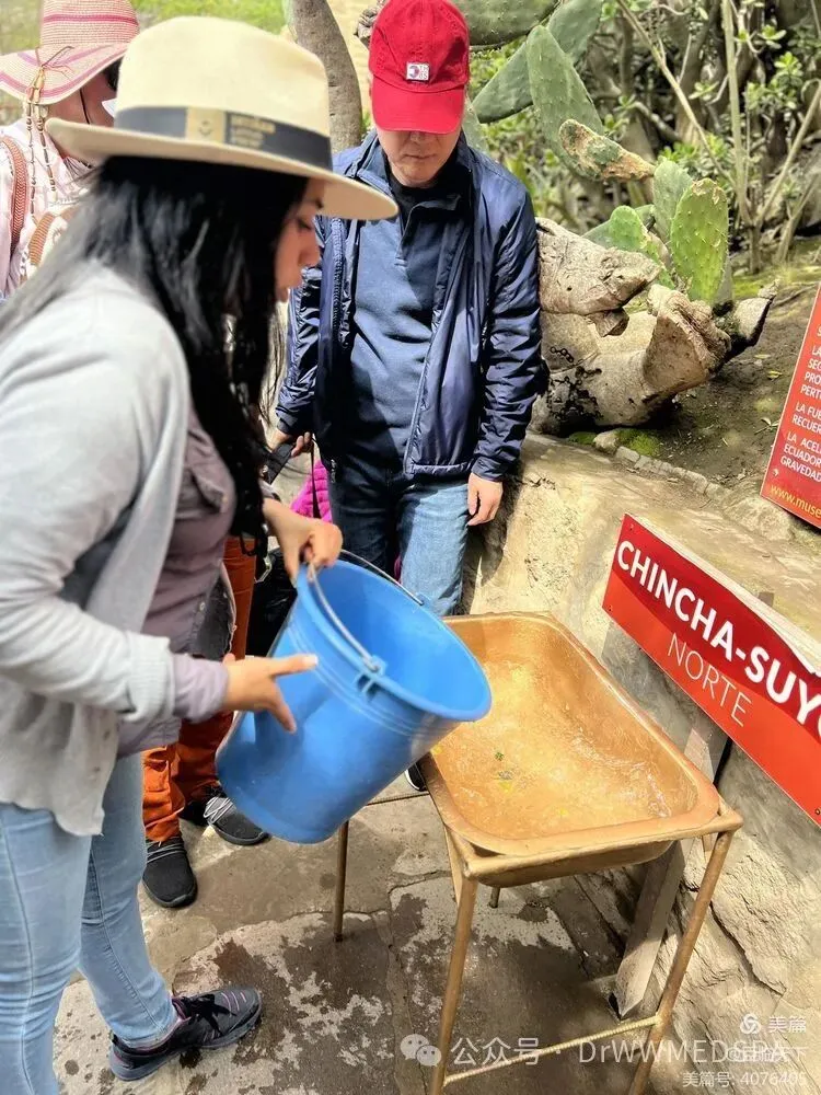 第二个实验是观察赤道两侧水漏时水流旋转的方向。在赤道线上,导游将水盆灌满水,放上几片绿叶,然后打开出水口,只见水流直往下漏,水面却没有旋转的迹象,漂浮在水面的树叶也摇摇晃晃没有任何旋转方向。然后导游把水盆水搬到赤道线北侧,水流和树叶在出水口打开后呈现逆时针旋转。然后导游又将水盆搬到几步之遥的赤道线的南侧,做了同样的实验,只见水流夹带着绿叶呈现出不同的顺时针旋转,好神奇哦!