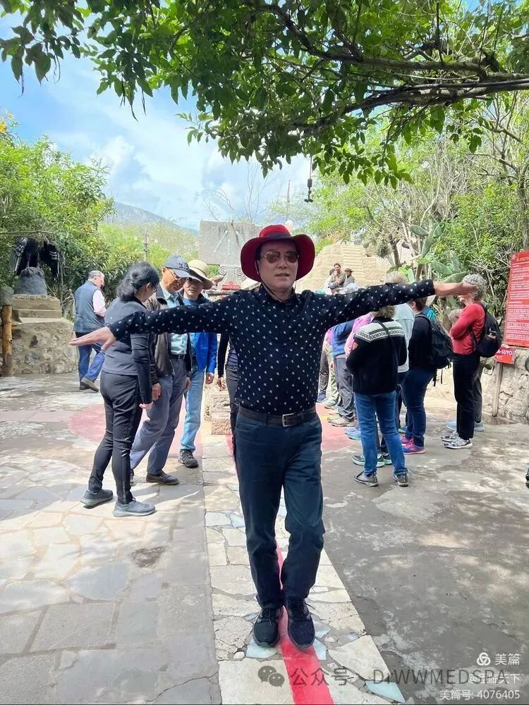 最后一个实验,导游让我们大家沿着赤道线一字排举起开头向上举起左臂,她轻轻地一拨大家举起的臂膊纷纷下落。导游解释说在赤道上物体失重所导致的现象。但也有例外,其中有一位曾是南京天文台研究生的团员坚挺臂膊,导游硬是在第一时间没有压下他举起的臂膊,导游的脸上滑过一丝尴尬的笑容。