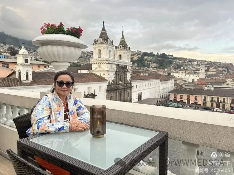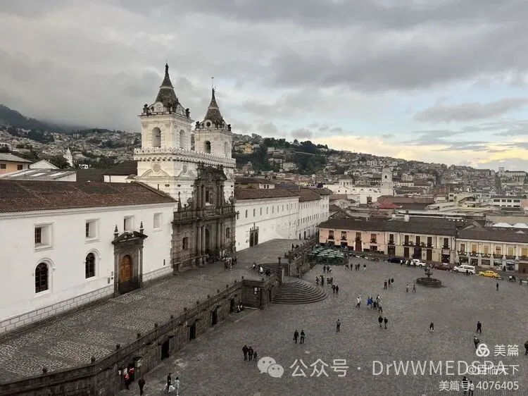 圣弗朗西斯科教堂被视为巴罗克式建筑风格的杰作,是西班牙-美洲宗教建筑的典范。虽然不能入内参观,在当地导游的引领下,我们登上基多最大的五星酒店的顶楼阳台,观看夕阳余晖下的圣弗朗西斯科广场与双塔大教堂,那景色真的美不胜收,令人心旷神怡,至此基多一日游的完美收官。