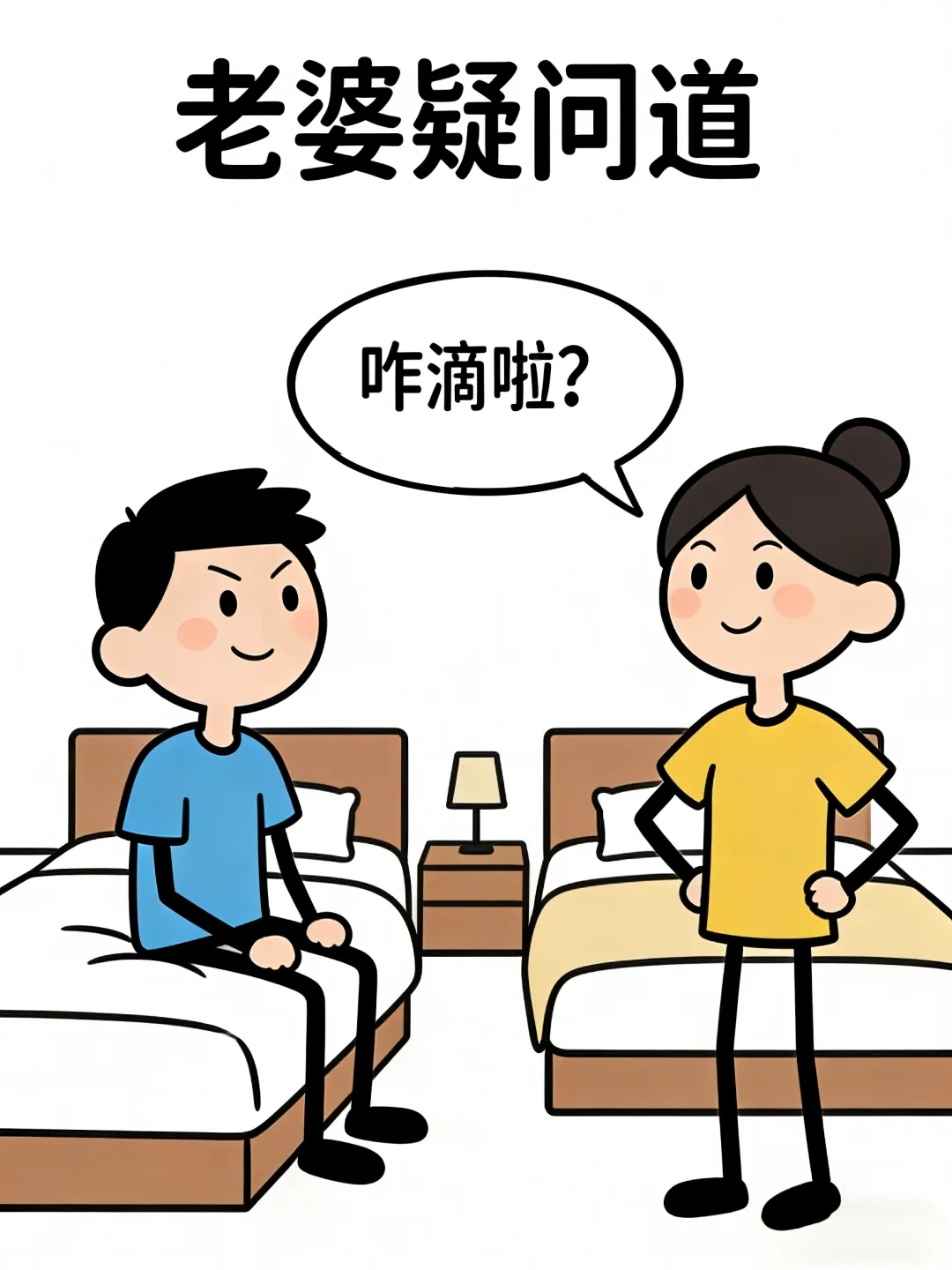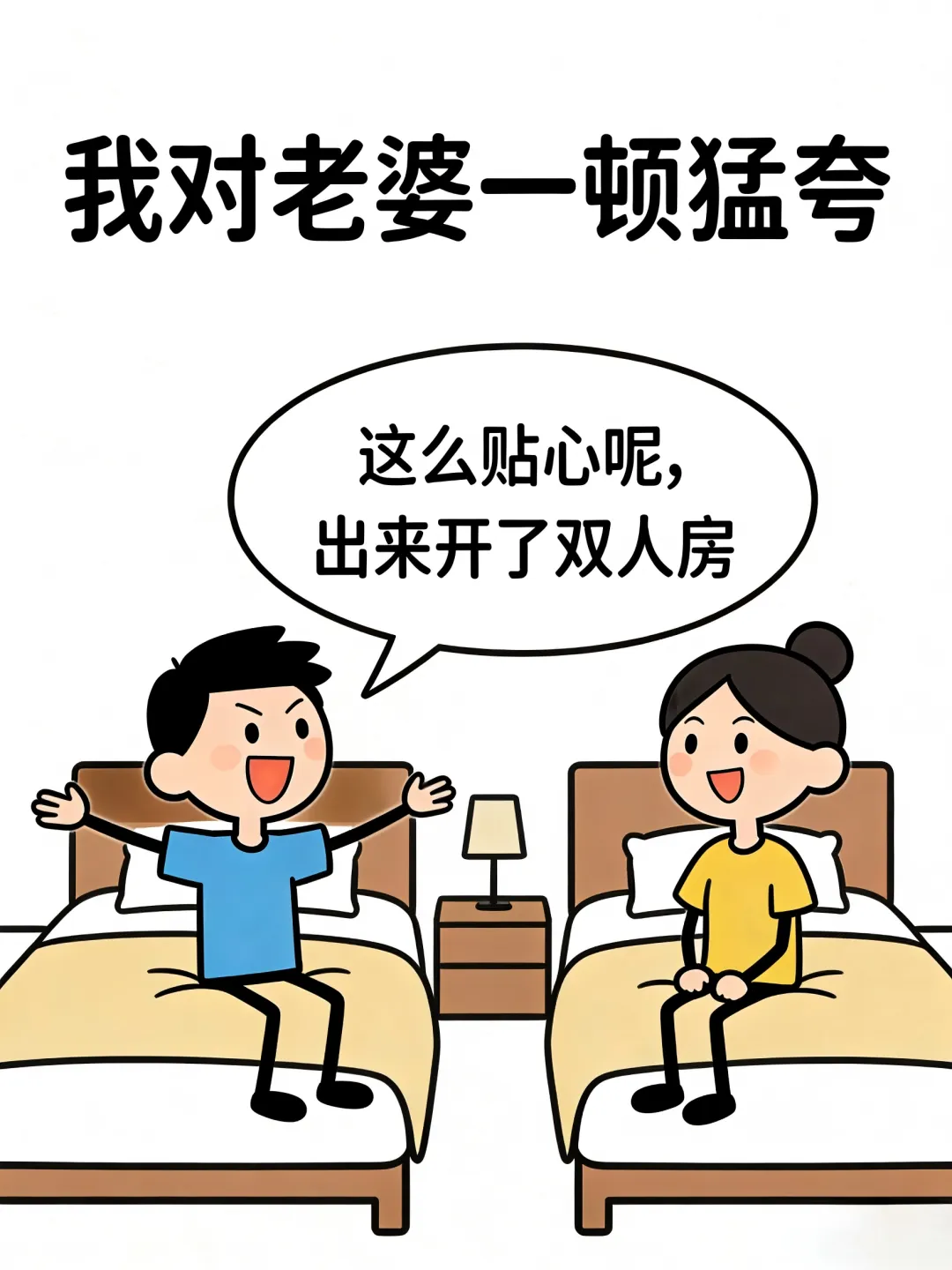 趣味漫画:和老婆出来旅游,她开了间双人床,我说:媳妇,咱俩认识15年了,你终于干把人事了,老婆疑问道:咋滴啦?我对老婆一顿猛夸