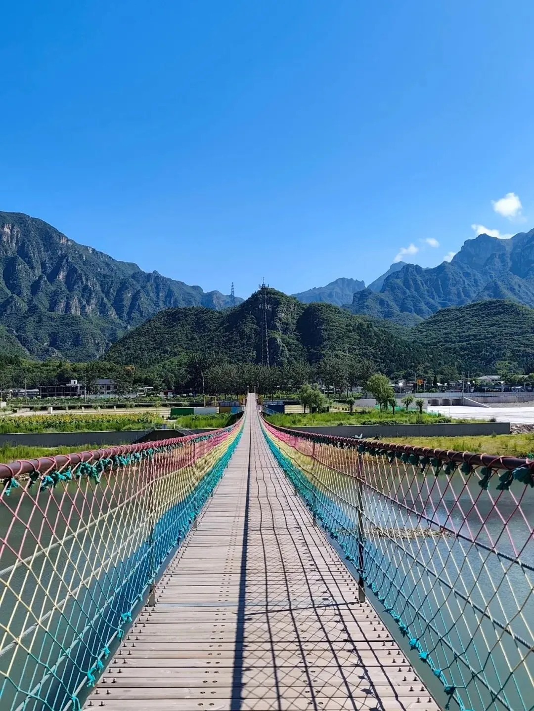 踏入孤山寨,必先走过横跨拒马河的铁索桥,这是景区的标志性打卡点。铁索桥晃晃悠悠,脚下是粼粼波光的碧水,两岸是叠翠峰峦与点缀的山花,春风拂过,草木清香扑面而来,站在桥上远眺,十渡的山水画卷徐徐展开,随手一拍都是无需滤镜的大片,刚入园便被这份自然之美治愈。