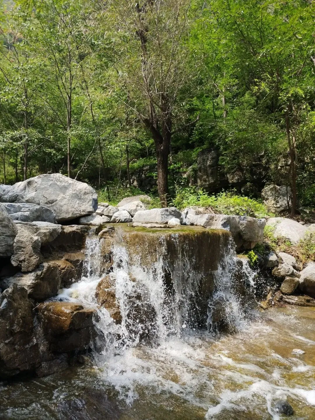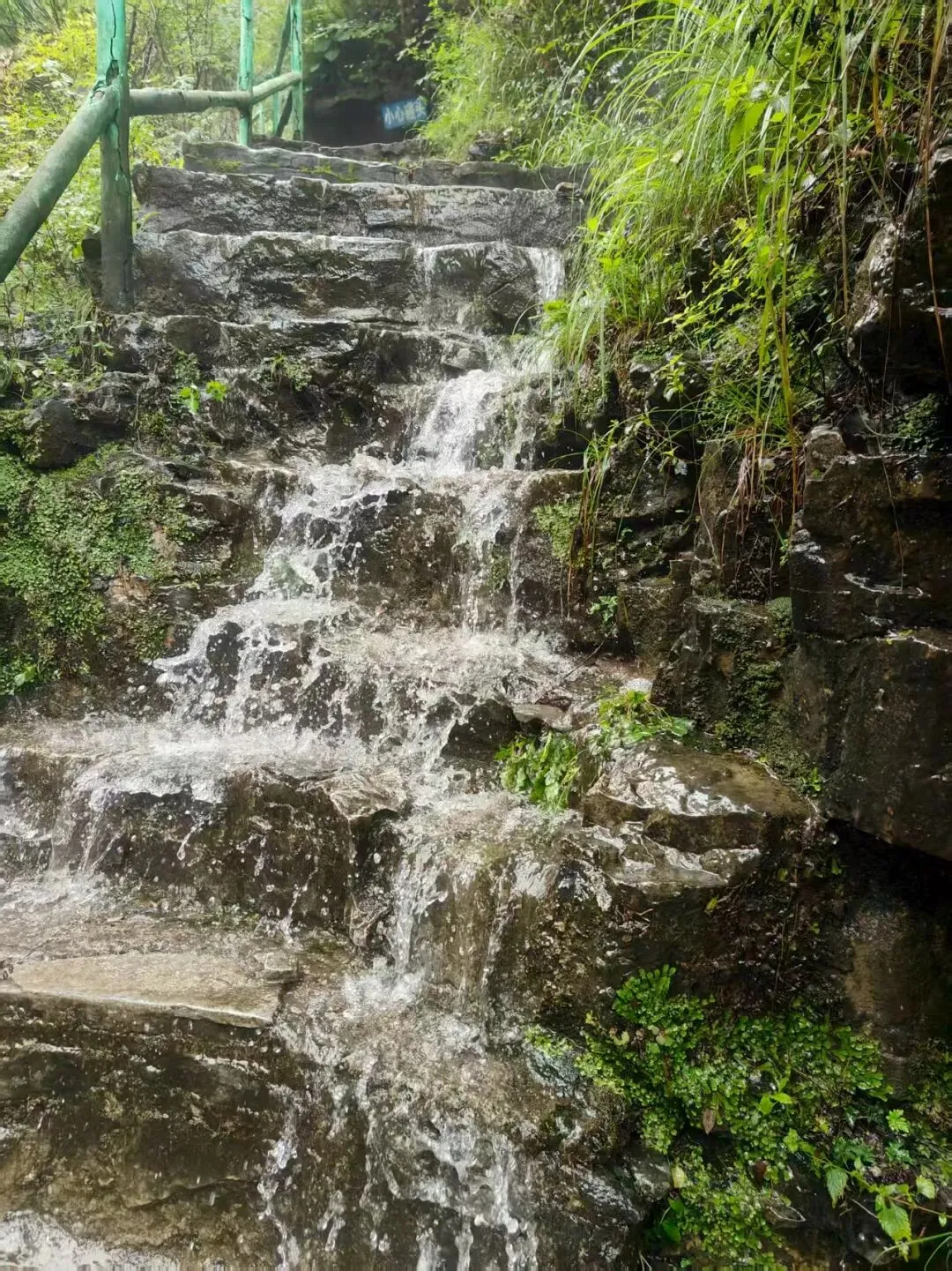 左侧的亲水路线直奔瀑布群,沿途潭瀑相连,步步是水。这里的瀑布没有磅礴的气势,却胜在小巧灵动:有的从岩壁倾泻而下,溅起碎玉般的水花;有的顺着石面缓缓流淌,形成可触摸的壁挂水幕;溪水浅而清澈,水底鹅卵石清晰可见,踩水、捞鱼、戏耍,大人小孩都能玩得尽兴,累了便坐在溪畔石头上,让清凉溪水漫过脚踝,所有疲惫都随水流消散。