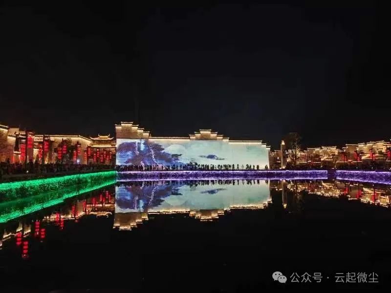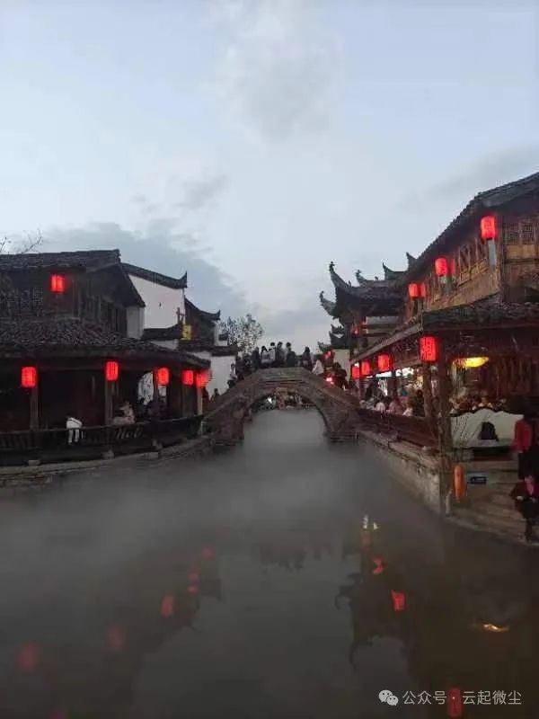 天色渐渐暗下来,夜幕降临的小镇灯光全部点亮,仿佛换上了新装。小镇变成了灯光的海洋,湖面上闪烁着五彩缤纷的灯光,四周喷着水雾,还有河岸两旁挂着一排排红色的灯笼,让我联想到“湖光秋月两相和,潭面无风镜未磨。”