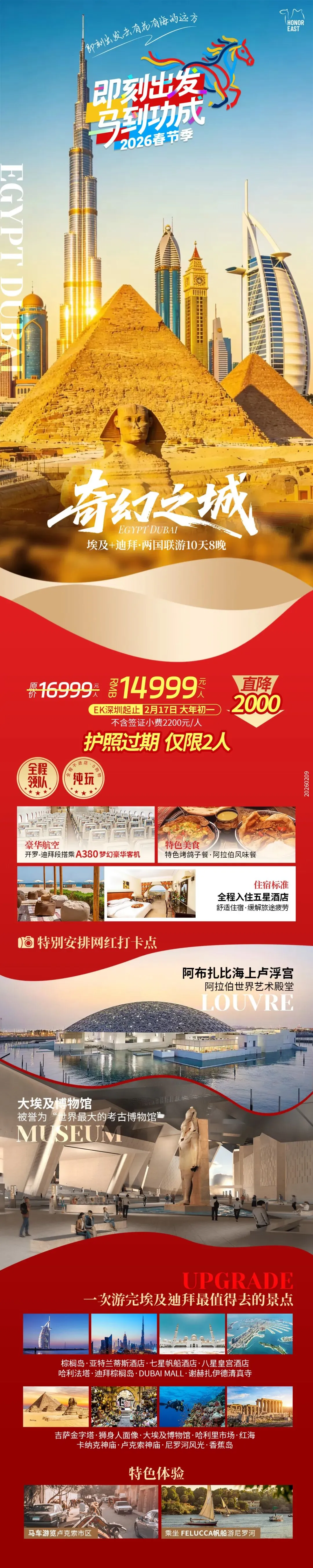 2026春节埃及+迪拜广州起止: 2月17日 直降2000✔全程入住五星级酒店✔特别安排:大埃及博物馆✔特别赠送:海上卢浮宫⛵尼罗河风帆船上岛+马车巡游卢克索🛫阿联酋航空/宽敞客机/一次游2国🛫迪拜开罗段/空客𝘼𝟯𝟴𝟬梦幻客机✔精华景点:吉萨金字塔/狮身人面像/大埃及博物馆/红海/卡纳克/卢克索神庙✔网红打卡:七星帆船/八星皇宫/哈利法塔/迪拜棕榈岛/谢赫扎伊德🍛特色烤鸽子餐➕阿拉伯风味餐+中餐