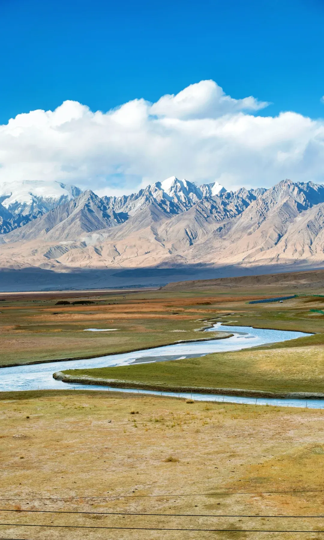 延绵弯曲的河流与金黄色湿地草甸交汇,十八罗汉雪山一排层叠作为背景,雪山之间是冰川,这个火山群特别出片。