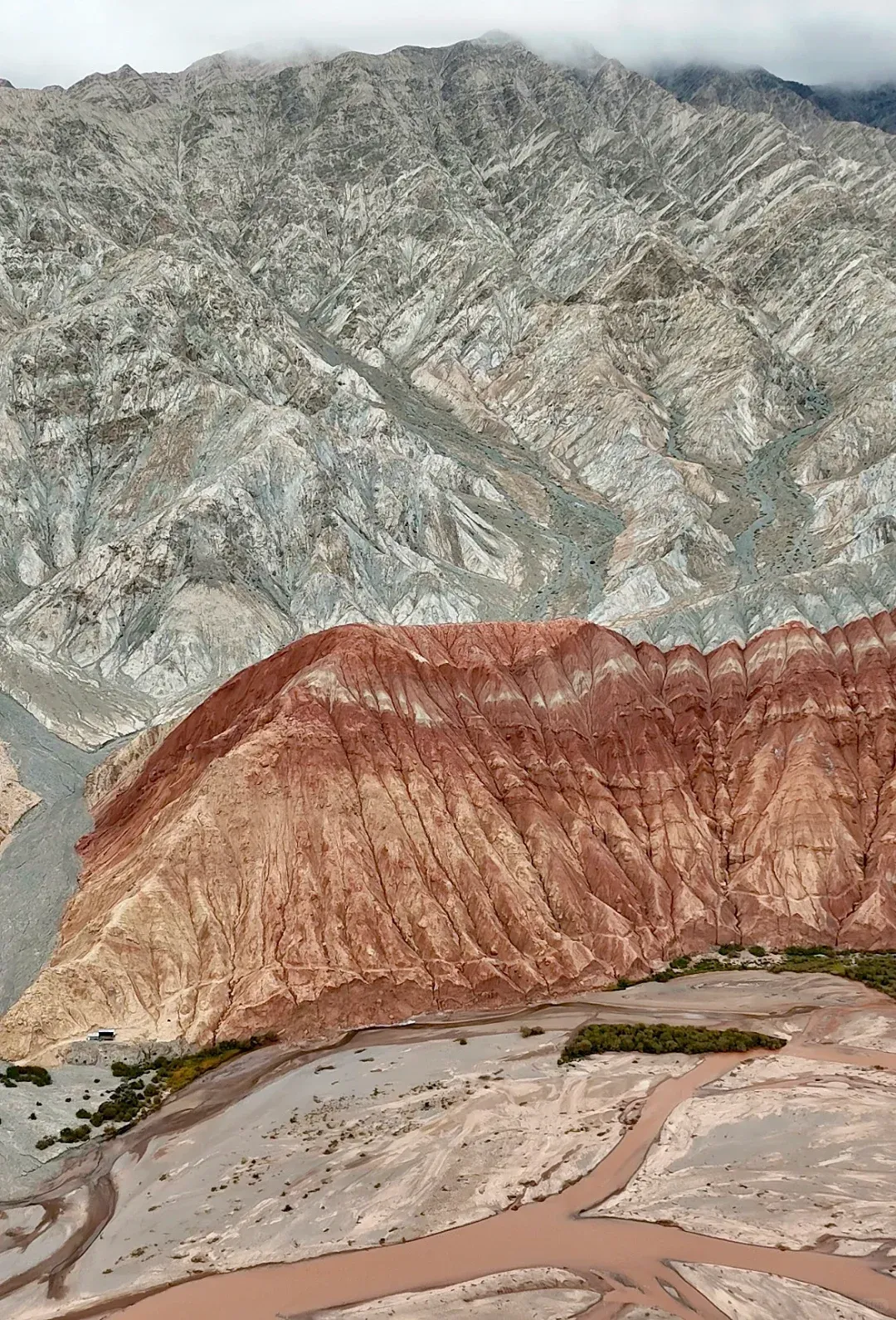 【天山与昆仑山交汇】是指天山与昆仑山在帕米尔高原的交汇处,这一自然奇观以色彩分明的山体、独特的地质风貌和壮丽的景观闻名。 天山山体呈驼红色,因含铁矿物质氧化形成独特色调。 昆仑山山体呈黛色,由深色岩层构成,与天山形成鲜明对比。此处是印度板块与欧亚板块碰撞形成的造山运动遗迹,堪称“地质博物馆”。