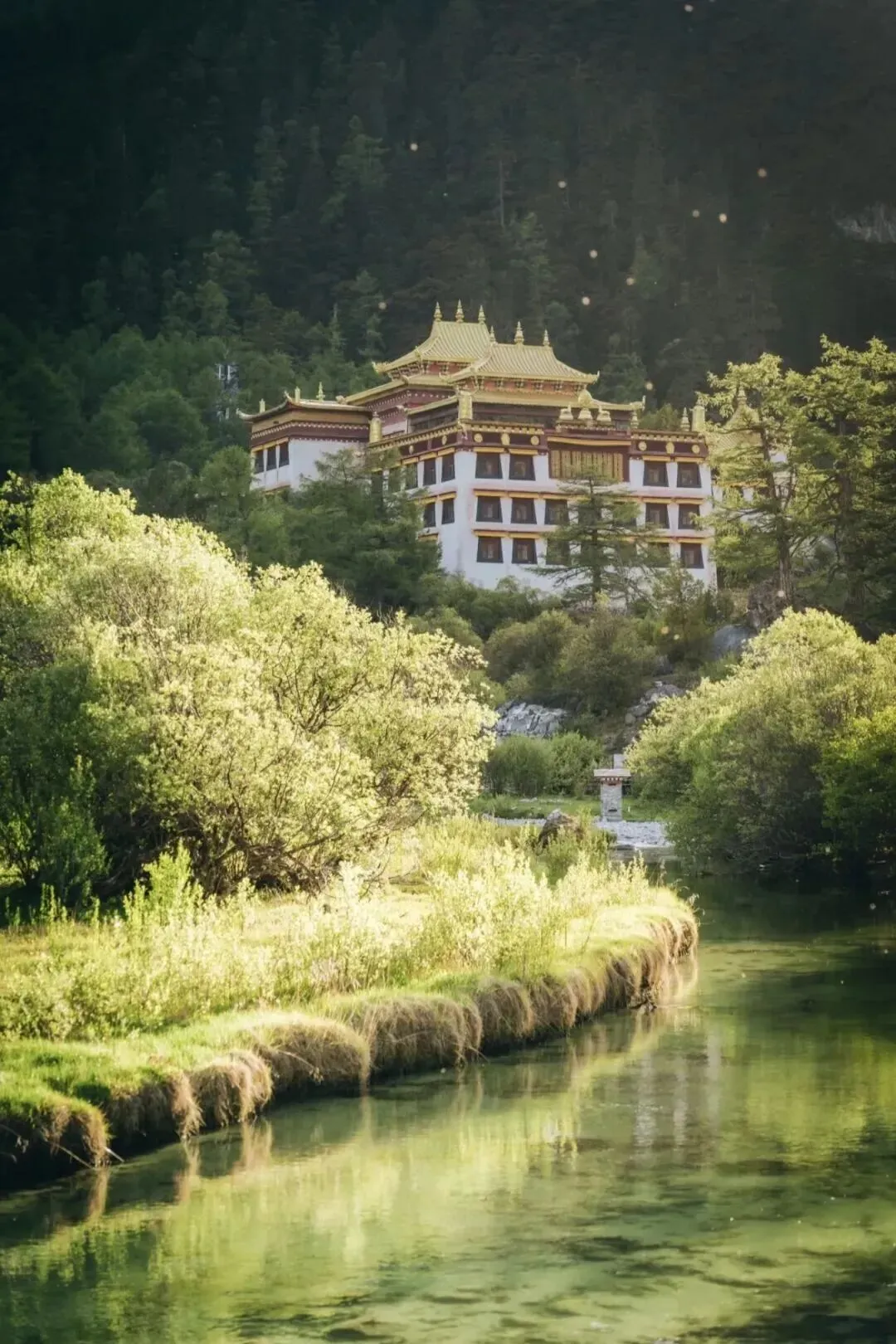 措普沟内的森林在春天也焕发出勃勃生机,针叶林和阔叶林交织在一起,新绿的树叶在阳光照耀下闪烁着生命的光芒。