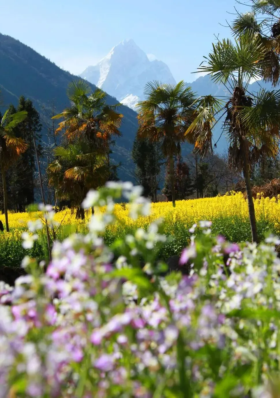 冷碛镇杵坭村的樱桃花、桃花、李花次第绽放,像藏在山里的世外桃源;德威镇加郡村的油菜花田一望无际,金黄花浪与贡嘎群峰遥相呼应;泸桥镇咱里村的梯田花海沿山势铺展,和雪山、露营地相映成趣,每一处都好拍又好逛!