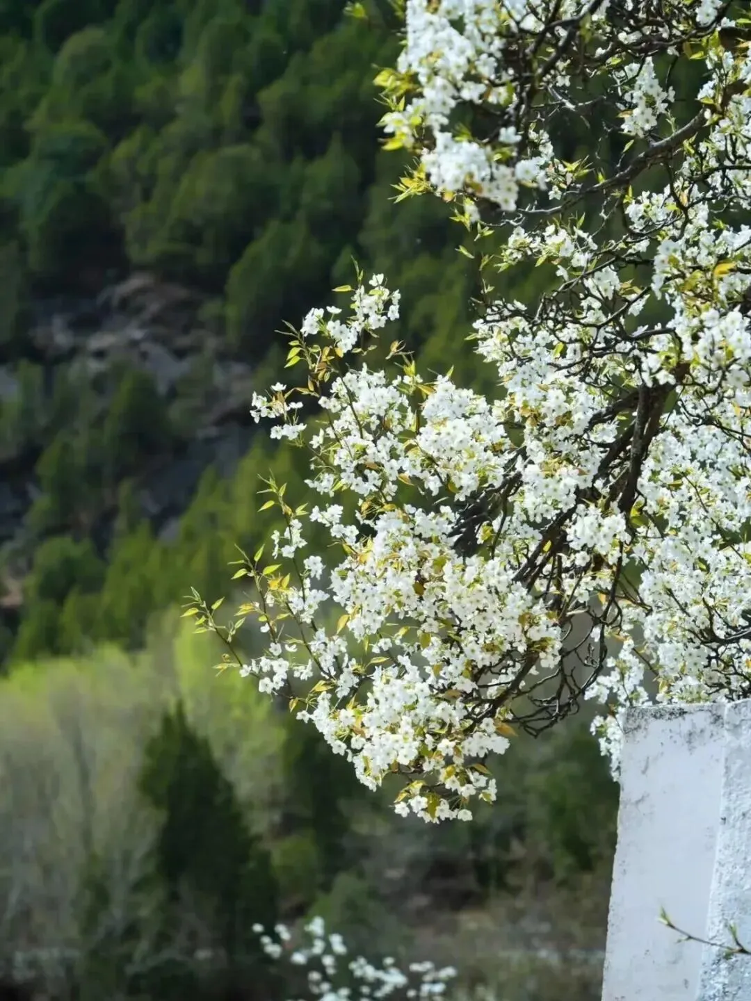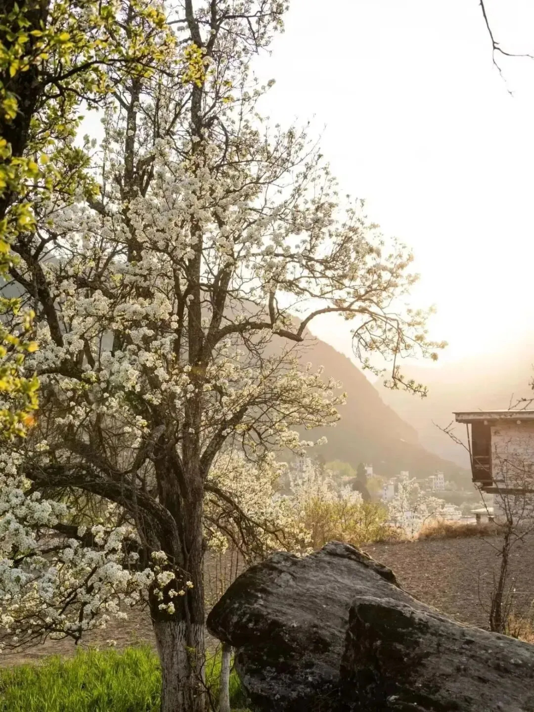 雪白的梨花如白雪覆盖枝头,桃花则娇艳欲滴,它们与红墙、白顶、黑碉楼相互搭配,色彩饱和度恰到好处,美不胜收。