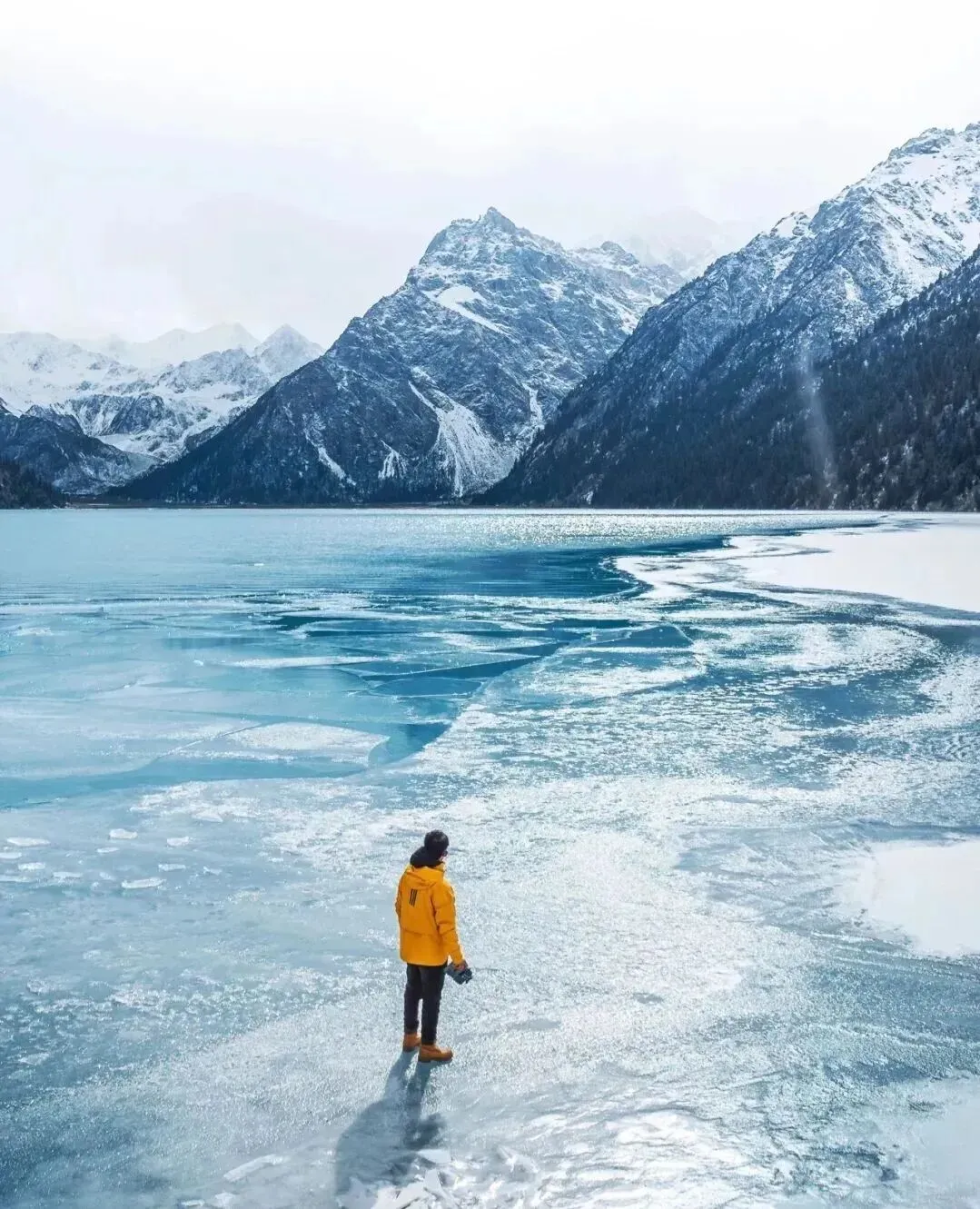 湖水开始逐渐解冻,波光粼粼,近岸处是半透明的浅碧,向湖心渐次晕染成蓝绿色,将雪山、天空和周围的山峦倒映其中,形成一幅流动的画卷。