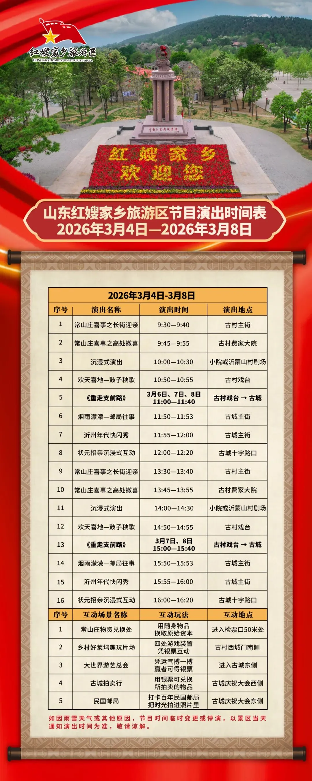 您现在的位置是:首页 > 国内旅游目的推荐 > 正文 国内旅游目的推荐 山东红嫂家乡旅游区3月4日-8日演出时间表发布! admin2026年03月01日 15:57:52国内旅游目的推荐1 山东红嫂家乡旅游区3月4日-8日演出时间表发布!识别下方小程序码即可购票欢迎来山东红嫂家乡旅游区导航:山东红嫂家乡旅游区游客服务中心 转载请说明来源于"旅荐网",部分内容转载自网络,如有侵权请联系qlwl@foxmail.com删除 本文地址:https://www.15386.cn/post/129289.html 上一篇 海南三亚��回头 天涯海角景区留念 下一篇 中国稳居泰国旅游最大客源市场 2026年初泰旅游业势头强劲 相关文章 重庆市旅游学校2026年招生简章(参考2025年) 中国稳居泰国旅游最大客源市场 2026年初泰旅游业势头强劲 海南三亚��回头 天涯海角景区留念 女神节特惠3月8号青岛崂山仰口景区观山海+海边纯玩无自费一日游38元转发朋友圈截图女士30.8元 预警!祁连这些景点千万别去,否则会“上瘾”到不想走! 正月十六走太平 | 全椒“走太平”文化旅游周活动预告来啦! “旅游警务”让游客安心放心舒心 太平洋保险畅意玩2号境内旅游险测评:短途出行全覆盖,高风险运动也能保 美丽的白廊景区 免票or半价!松滋景区毕业季福利来了 发表评论 取消回复 评论列表 这篇文章还没有收到评论,赶紧来抢沙发吧~
