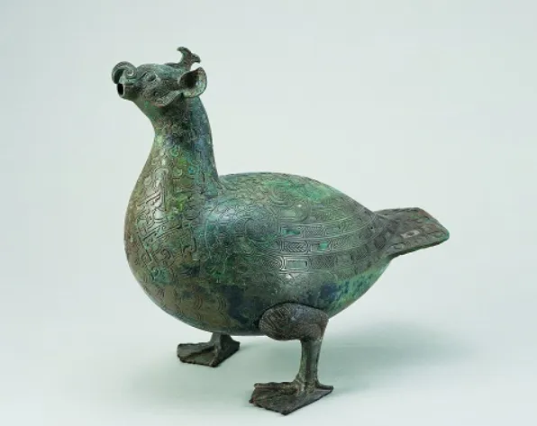 战国青铜鸟形尊,堪称巴人艺术的极致体现。鱼嘴、鹰鼻、凤冠、鸽身、鸭足,融合多种瑞兽造型,通体镶嵌绿松石,精巧绝伦。这件贵族酒器,实则更似祭祀礼器,每一道纹路、每一处雕琢,都藏着巴人的信仰与审美。
