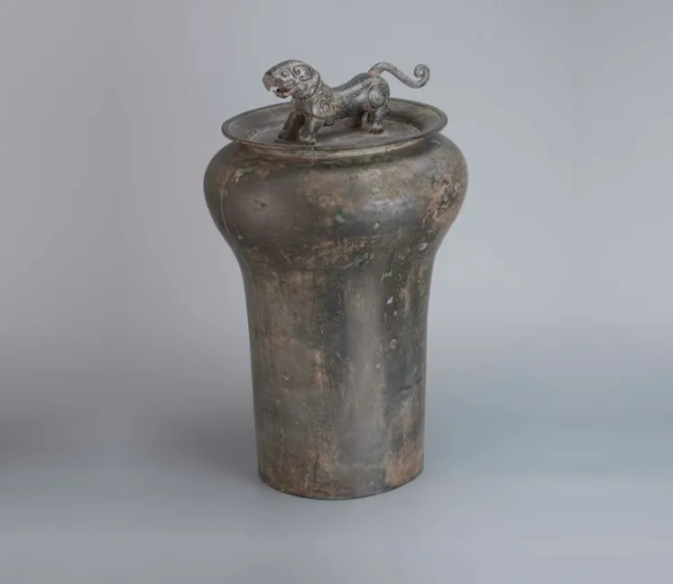 一旁的战国虎钮錞于,被誉为 “錞于王”。高 68 厘米,重 30 公斤,顶部虎钮矫健威猛,周身刻满巴蜀图语。作为古代军乐器,它曾伴随巴人军队冲锋陷阵,号令三军、祭祀天地,是巴人虎崇拜的核心物证,也是巴文化最具代表性的文物。