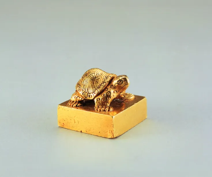 还有东汉偏将军印章,纯金铸造,含金量高达 96%,龟钮方印,篆书工整清晰。全国两汉金印仅存 15 枚,这枚金印便是其中之一,寥寥数字,承载着汉代的官制文化与历史风云。