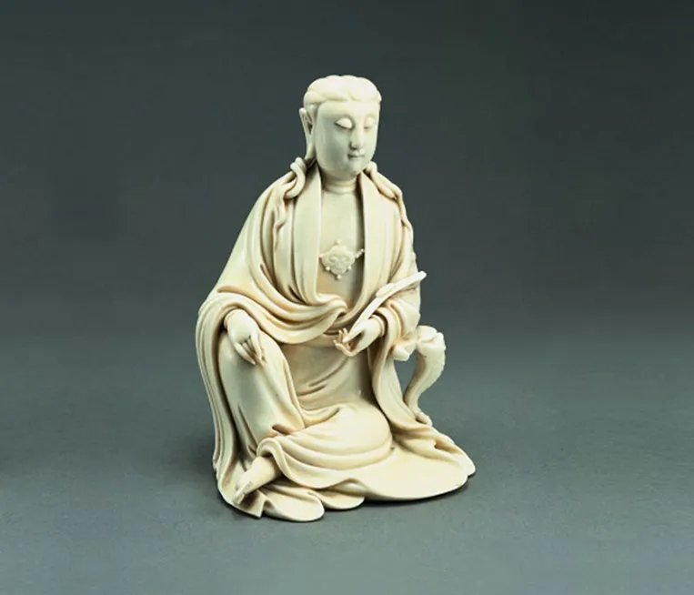 明德化窑何朝宗款白瓷观音坐像,瓷圣何朝宗传世佳作,“猪油白” 瓷质细腻温润,观音面容慈祥,衣纹流畅自然,是明代宗教瓷塑的巅峰之作,一眼惊艳,静心震撼。