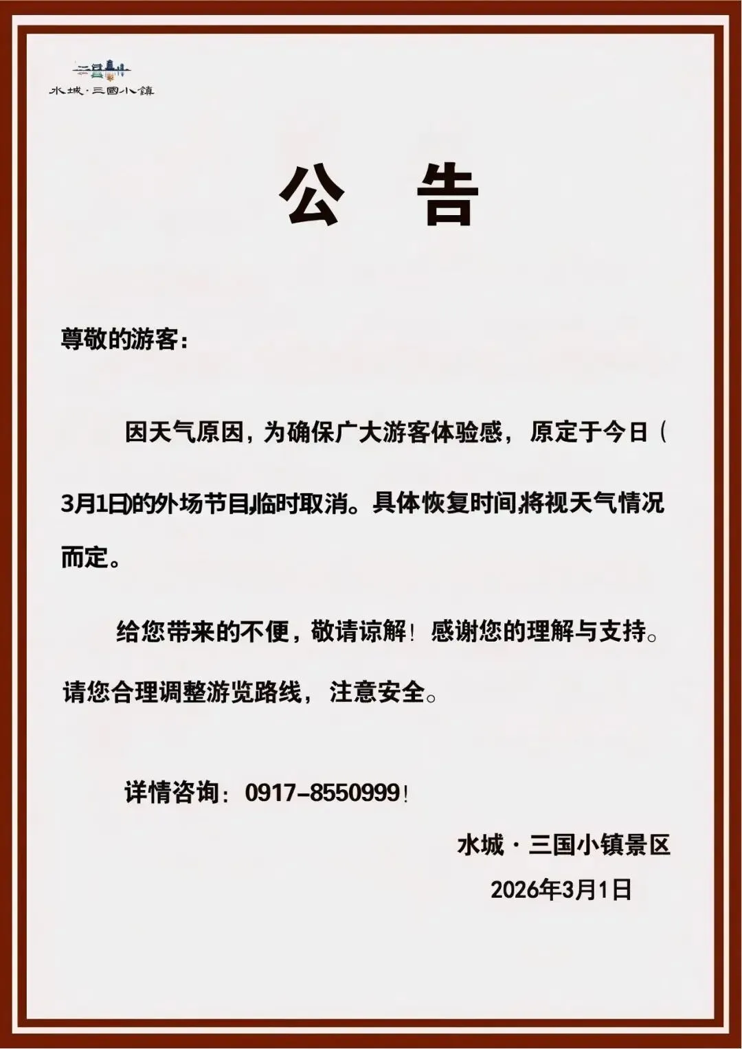 您现在的位置是:首页 > 国内旅游目的推荐 > 正文 国内旅游目的推荐 关于三国小镇景区3月1日外场节目临时取消的公告 admin2026年03月01日 16:43:30国内旅游目的推荐2 关于三国小镇景区3月1日外场节目临时取消的公告 转载请说明来源于"旅荐网",部分内容转载自网络,如有侵权请联系qlwl@foxmail.com删除 本文地址:https://www.15386.cn/post/129338.html 上一篇 【青岛4天组团旅游】2026紧凑行程规划+时间管理优化攻略 下一篇 勐腊公安热烈欢迎全国公安战友到勐腊旅游 相关文章 景区预报:3月1日 男子恶意拼接视频抹黑海口旅游形象……警方:行拘7日! 赴一场春日花事!贵阳这十个赏花景点公交直达 准备好了吗?新湾这条退休旅游必走的路线,解锁沙地文化密码 中国现场统计研究会旅游大数据分会、全国工业统计教学研究会数字经济与区块链技术协会2026年年会会 议 通 知(第二轮) 台湾十个旅游景点 【黄河口生态旅游区】错峰出游 感受正月里的“松弛感”! 孝河春节旅游专栏 | 玩味潮汕 #山东威海旅游打卡 一池天鹅舞山海同春歌! 快来看更多景区期待您的到来…… 发表评论 取消回复 评论列表 这篇文章还没有收到评论,赶紧来抢沙发吧~