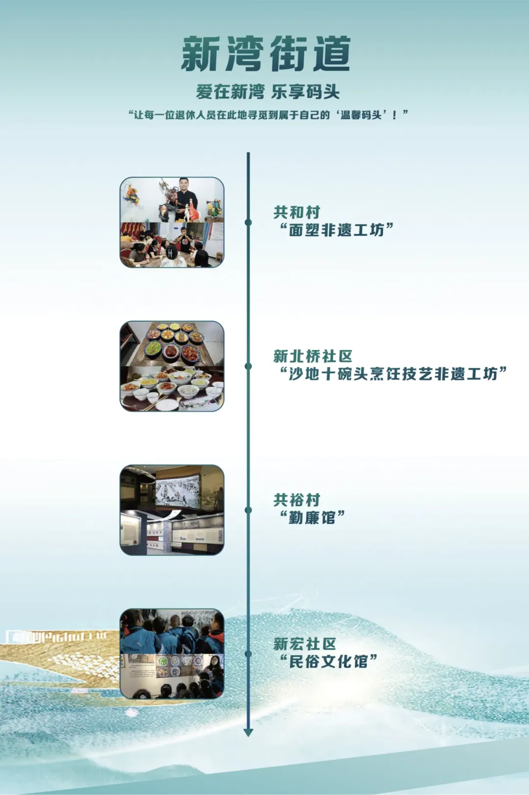近日,新湾街道面向企退人员发布了“一街一品”打卡路线,以“爱在新湾 乐享码头”为品牌的旅游路线图涵盖了面塑非遗工坊、沙地十碗头烹饪技艺非遗工坊、勤廉馆、民俗文化馆等多个点位,将新湾特色文化串珠成链,多维度展示新湾街道的文化韵味及鲜明的辨识度。