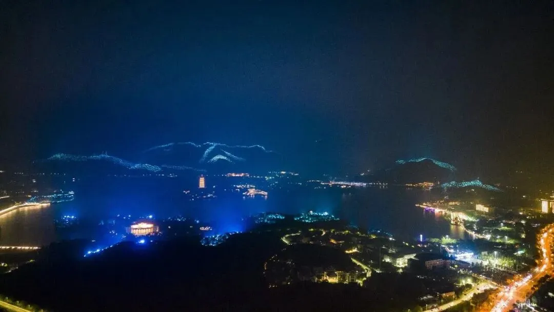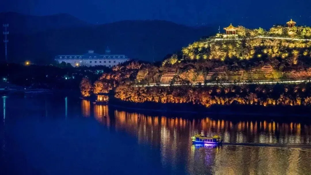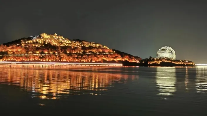 当夜幕降临,雁栖湖环湖灯光全线点亮,4万余套光影与湖面交相辉映,流光溢彩,宛如银河坠入人间;周边十余座山脉灯光次第绽放,以国画写意手法勾勒山峦轮廓,远天际线、湖岸线、灯际线层层交织,绘就璀璨湖山夜画卷。