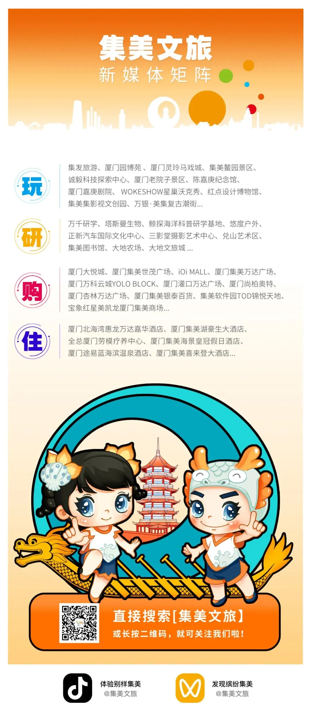 在集美学村门牌坊,你可以遇见“状元才”,感受集美的百年文脉传承;走进浪漫发生地十里长堤,“好姻缘”和“吃百二”邀你一同欣赏橘子海日落、草地乐队LIVE、后备箱市集......五月天大公仔也在这里,约上小伙伴Z“练团”打卡吧!